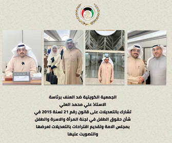 شاركت الجمعية الكويتية ضد العنف برئاسة الأستاذ علي محمد العلي في مناقشة التعديلات المقترحة على قانون رقم (21) لسنة 2015 في شأن حقوق الطفل، وذلك خلال اجتماع لجنة المرأة والأسرة والطفل في مجلس الأمة. وقدّمت الجمعية عدداً من التعديلات والمقترحات التي سيتم عرضها والتصويت عليها، بهدف تعزيز حماية الطفل قانونيًا واجتماعيًا، وتطوير الآليات المتعلقة بالوقاية من العنف، وضمان حقوقه في بيئة آمنة وصحية تتوافق مع الاتفاقيات الدولية والمعايير الإنسانية. وأكدت الجمعية أن دورها جزء من مسؤوليتها الوطنية تجاه الأسرة والطفولة، وأن التعاون مع الجهات التشريعية يمثل خطوة مهمة نحو تحسين جودة الحياة للأطفال في الكويت.