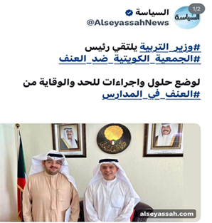 التقى وزير التربية رئيس الجمعية الكويتية ضد العنف الأستاذ علي محمد العلي، حيث تمت مناقشة مجموعة من الحلول والإجراءات الهادفة إلى الحد من العنف داخل المدارس، وتعزيز بيئة تعليمية آمنة تحفظ الطلاب من السلوكيات السلبية. وشهد اللقاء بحث آليات عملية للوقاية المبكرة، ودور الإدارات المدرسية والأسر في حماية الأبناء، إضافة إلى تبني برامج توعوية وتربوية تسهم في غرس قيم التسامح والاحترام داخل المجتمع المدرسي.