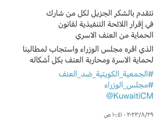 الجمعية_الكويتية_ضد_العنف نتقدم بجزيل الشكر والتقدير لكل من ساهم في إقرار اللائحة التنفيذية لقانون الحماية من العنف الأسري، الذي اعتمده مجلس الوزراء، استجابة للمطالب الرامية إلى حماية الأسرة ومحاربة العنف بجميع أشكاله. ويُعد هذا الإنجاز خطوة مهمة نحو تعزيز الأمن الأسري والاجتماعي، وتفعيل الأدوات القانونية التي تحفظ حقوق الأفراد وتوفر بيئة آمنة تقوم على العدالة والاحترام.