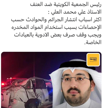 صرّح رئيس الجمعية الكويتية ضد العنف، الأستاذ علي محمد العلي، بأن الإحصاءات تشير إلى أن استخدام المواد المخدرة يُعد من أبرز أسباب انتشار الجرائم والحوادث في المجتمع. وأكد العلي ضرورة وقف صرف بعض الأدوية في العيادات الخاصة، لما لها من دور في تفاقم المشكلة ووصولها إلى فئات غير مستحقة، مشدداً على أهمية تشديد الرقابة وتفعيل الإجراءات القانونية لحماية المجتمع والحد من هذه الظاهرة الخطيرة.